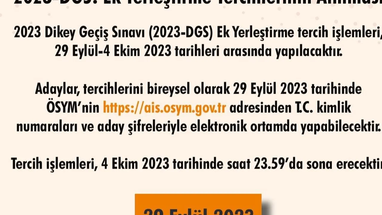 ÖSYM’den yapılan açıklamaya göre, 2023-DGS ek yerleştirme tercih işlemleri başladı. Adaylar, tercihlerini ÖSYM’nin https://ais.osym.gov.tr adresinden T.C. kimlik numaraları ve aday şifreleriyle elektronik ortamda yapabilecek. Tercih işlemleri, 4 Ekim 2023 tarihinde saat 23.59’da sona erecek.