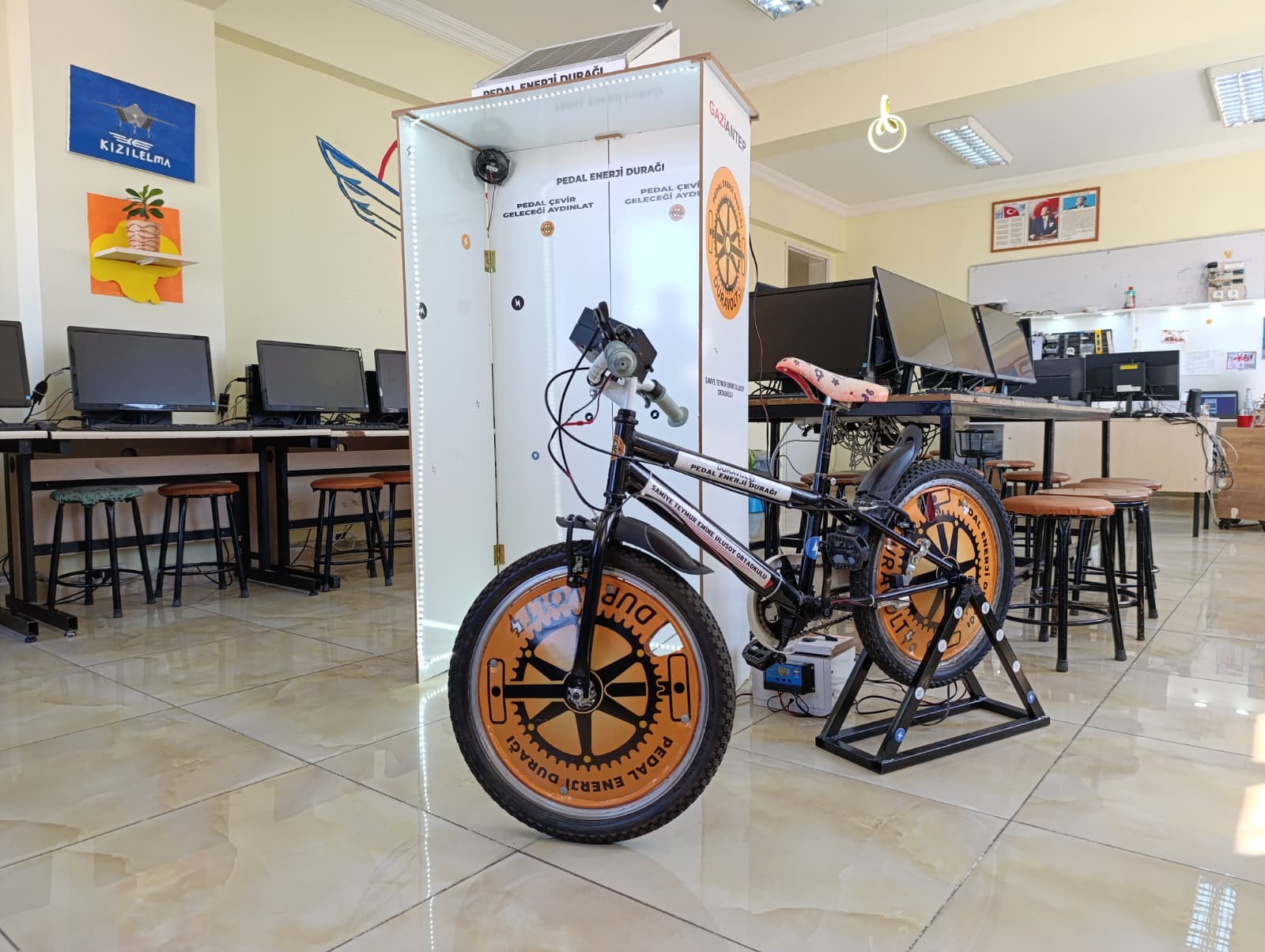 Çalışma kapsamında okul bahçelerine ve koridorlarına, toplu taşıma araçları duraklarına, AVM’ler ile kent meydanlarına konulması için bisiklet üzerinden elektrik üreten ve bakiye kazandıran bir sistem geliştiren öğrencilerin projesi büyük takdir topladı.