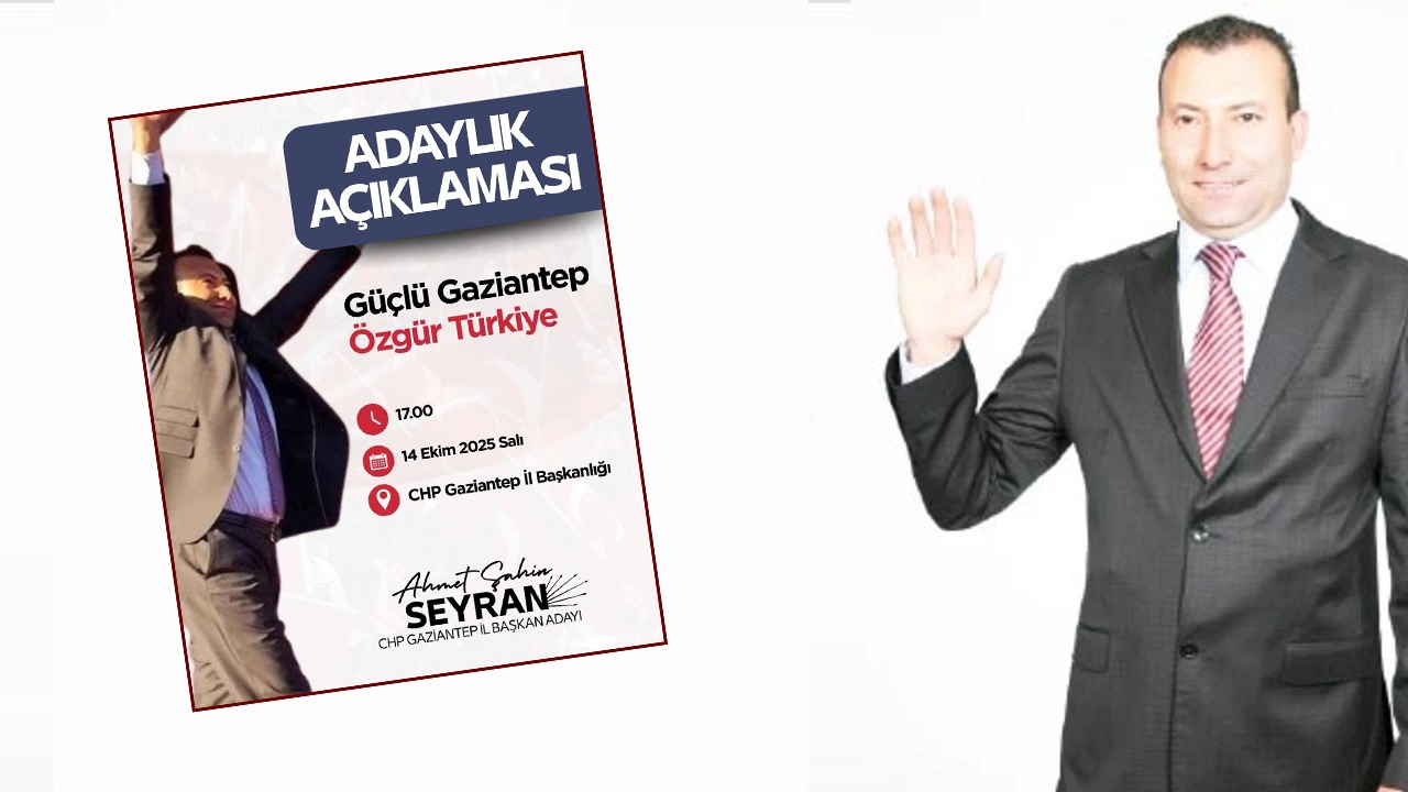 Daha önce CHP Gaziantep Milletvekili adayı olan Ahmet Şahin Seyran, il başkanlığına aday olduğunu duyurdu. Şahin Seyran, 14 Ekim Salı günü saat 17:00’de adaylığını resmi olarak açıklayacağını duyurdu.