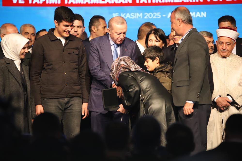Cumhurbaşkanı Erdoğan, "Biz sadece işimize bakıyoruz. Biz lafla değil, eserle konuşan bir anlayışın sahibiyiz. Ana muhalefetle aramızdaki zihniyet farkını görmek için şu rakamlar bile yeterlidir. Bugün deprem bölgemizdeki 11 ilimizde 174 ayrı alanda 3 bin 481 şantiyede 200 bin mimar, mühendis ve işçi kardeşimiz 7 gün 24 saat esasıyla çalışıyor. Dakikada 3 saatte 23 günde 550 yeni konut yapıyoruz. İnsanımızın hayatına dokunan şehirlerimizin çehresini değiştiren projelerle yol alıyoruz. Geçtiğimiz günlerde 500 bin sosyal konut projemizi ilan ettik. 10 Kasım'da da başvurular başladı. Milletimiz projeye çok yoğun ilgi gösteriyor. Kampanyamız kapsamında Adıyaman’ımıza da 5 bin sosyal konut yapacağız. Merkezde, Besni’de Çelikhan’da Gerger’de Gölbaşı’nda Kahta’da Samsat’ta Tut’ta yerlerimizi belirledik. Başvurular bittikten sonra temelleri atacak evlerimizi hızla teslim edeceğiz. Evlerinin anahtarlarını almaya hak kazanan vatandaşlarımızı tebrik ediyorum. Bu eserlerimizin yapımında emeği geçen herkese teşekkür ediyorum" diye konuştu.