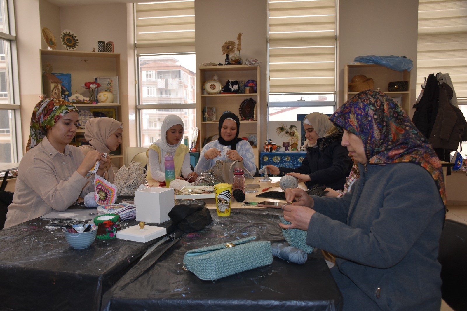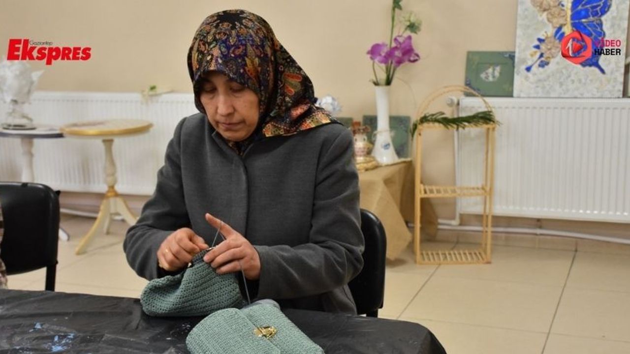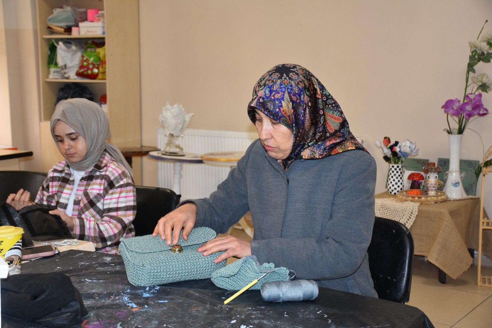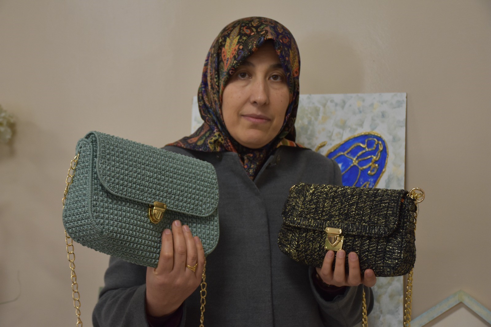 Kurstaki kadınların ve Feyza Say'ın el emeği göz nuru yaptıkları birbirinden güzel çantalar ile dekoratif süs eşyaları göz kamaştırıyor.