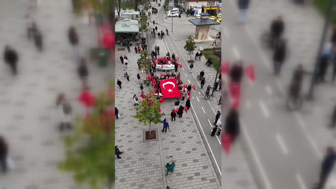 Burada, Atatürk'ün doğum yılına ithafen 1881 işlemeyle yapılan Türk bayrağını açan kadınlar, marşlar söyleyerek Anıtpark Meydanı'na yürüdü.