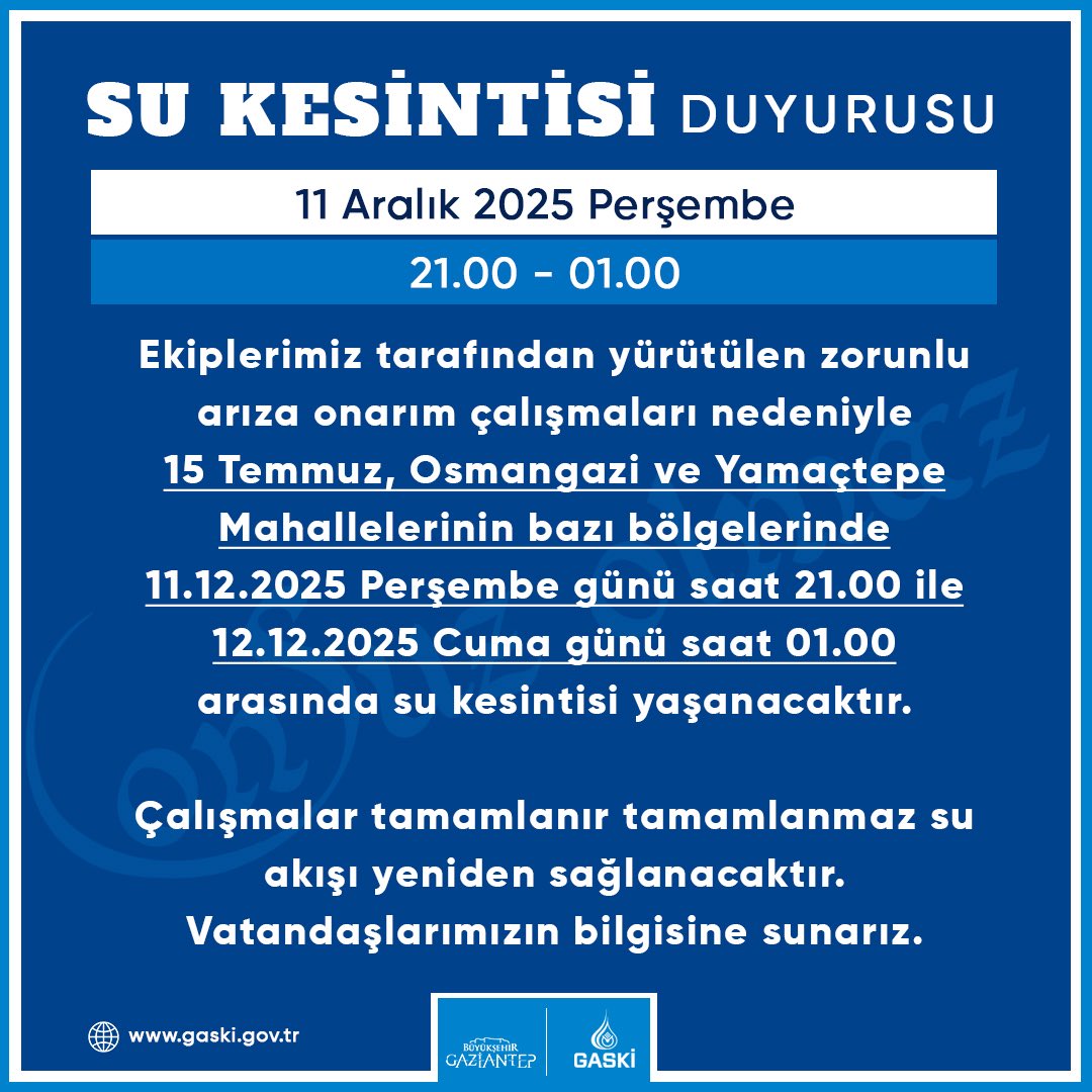 GASKİ yaptığı duyuruda ''Su Kesintisi… Ekiplerimiz tarafından yürütülen zorunlu arıza onarım çalışmaları nedeniyle 15 Temmuz, Osmangazi ve Yamaçtepe Mahallelerinin bazı bölgelerinde 11.12.2025 Perşembe günü saat 21.00 ile 12.12.2025 Cuma günü saat 01.00 saatleri arasında su kesintisi yaşanacaktır. Çalışmalar tamamlanır tamamlanmaz su akışı yeniden sağlanacaktır..'' açıklamasında bulundu.