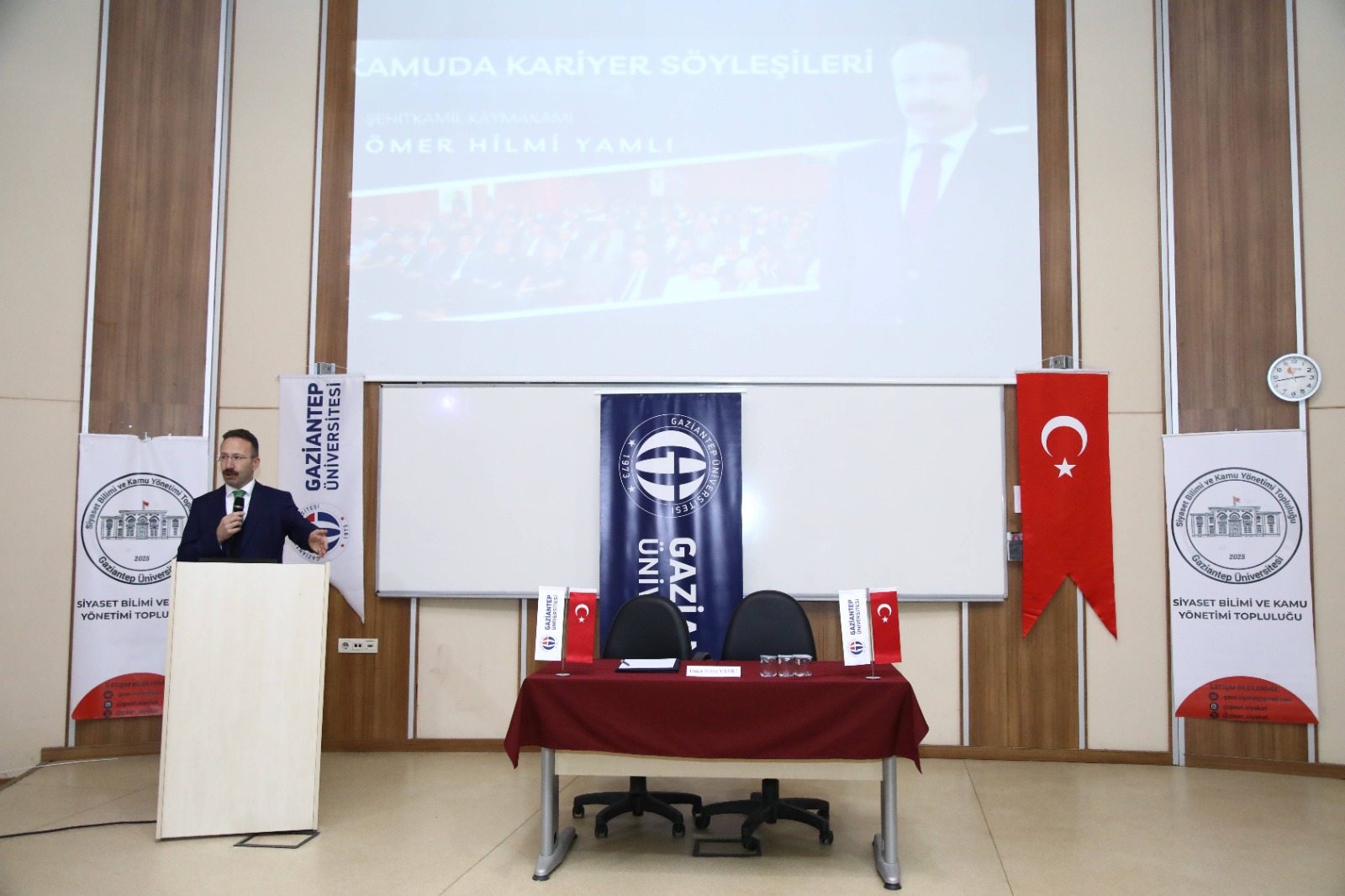 Öğrencilerle bir araya gelen Ömer Hilmi Yamlı, kamu yönetiminde kariyer yolculuğundan atanma süreçlerine, yerel yönetimlerde üstlenilen sorumluluklardan edindiği idari tecrübelere kadar pek çok konuda bilgi paylaştı. Kaymakamlık mesleğinin gerektirdiği yetkinlikleri anlatan Yamlı, kaymakamlığa giden yolda geçilen aşamalarla birlikte kaymakam refikliği ve kaymakam adaylığı süreçlerini de ayrıntılarıyla açıkladı. Kaymakamlığın güçlü iletişim becerisi, toplumla etkili ilişki kurma, kriz anlarında doğru karar verebilme ve yüksek sorumluluk bilinci gerektiren bir meslek olduğunu vurgulayan Yamlı, mesleğe ilgi duyan öğrencilerin bu alanlarda kendilerini geliştirmelerinin önemine dikkat çekti.