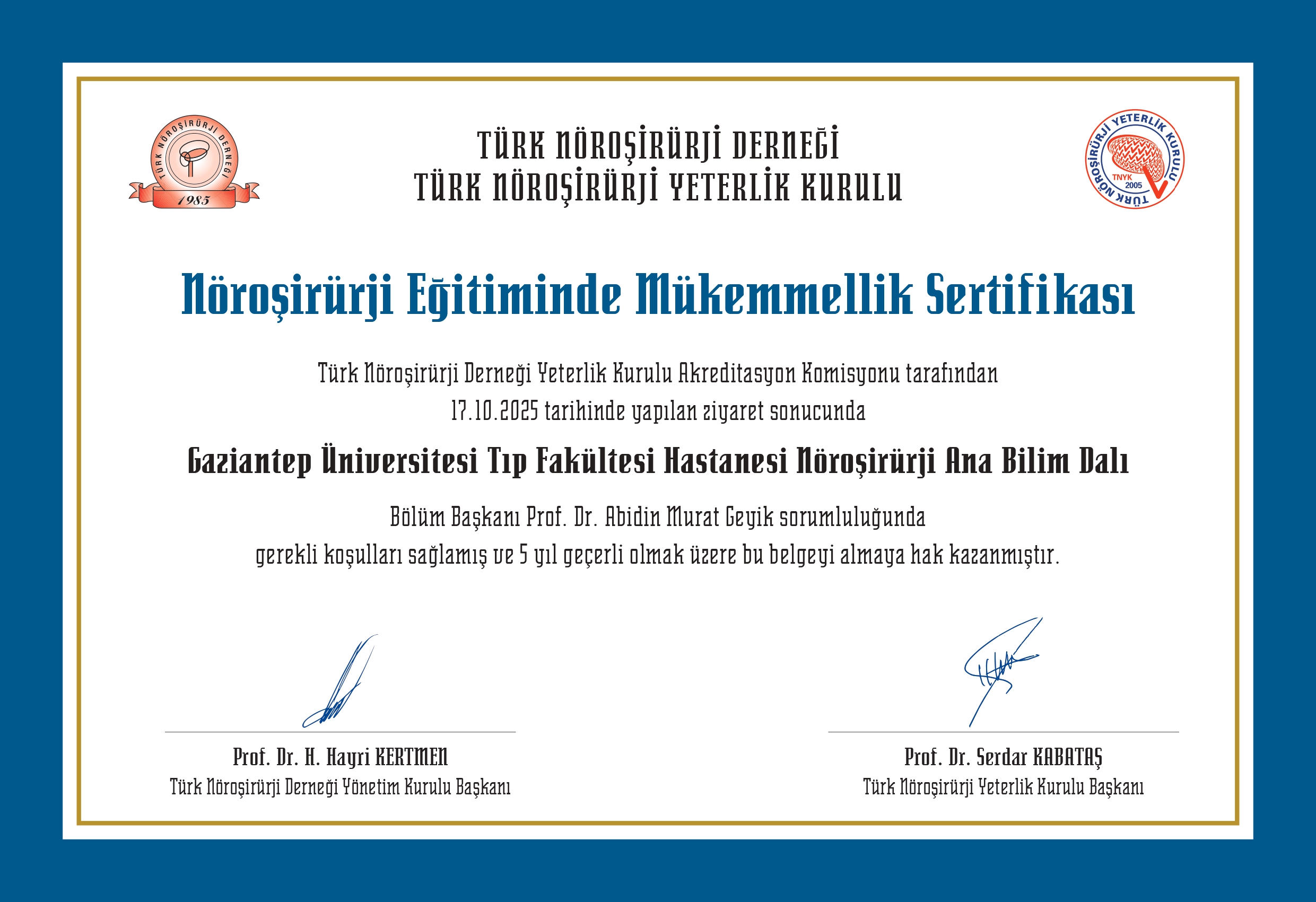 Değerlendirme sonucunda, GAÜN Hastanesi Beyin ve Sinir Cerrahisi Anabilim Dalı Başkanı Prof. Dr. Abidin Murat Geyik sorumluluğunda yürütülen nöroşirürji uzmanlık eğitiminin, dernek tarafından belirlenen ulusal standartları karşıladığı tespit edildi. Bu kapsamda verilen sertifikanın 5 yıl süreyle geçerli olacağı bildirildi.