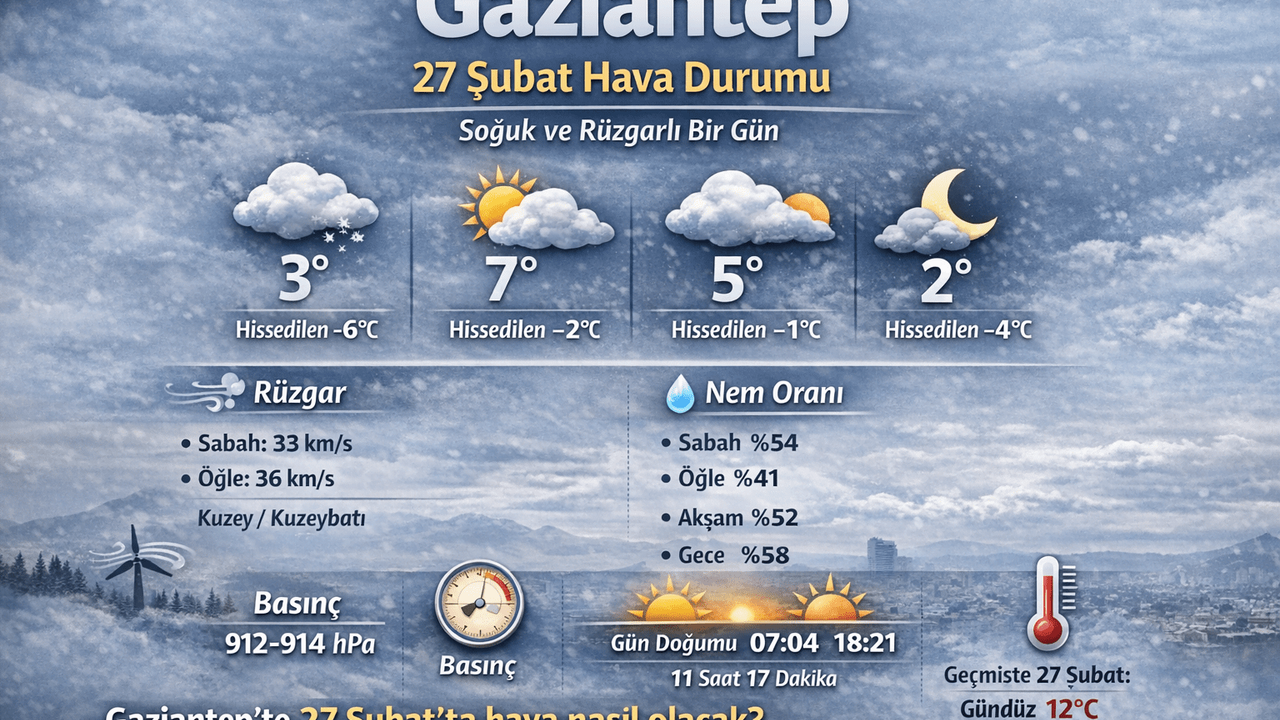 Gaziantep’te 27 Şubat günü hava soğuk ve parçalı bulutlu olacak. Gün içinde en yüksek sıcaklığın 7 dereceye kadar çıkması beklenirken, rüzgâr nedeniyle hissedilen sıcaklık sıfırın altına düşecek.