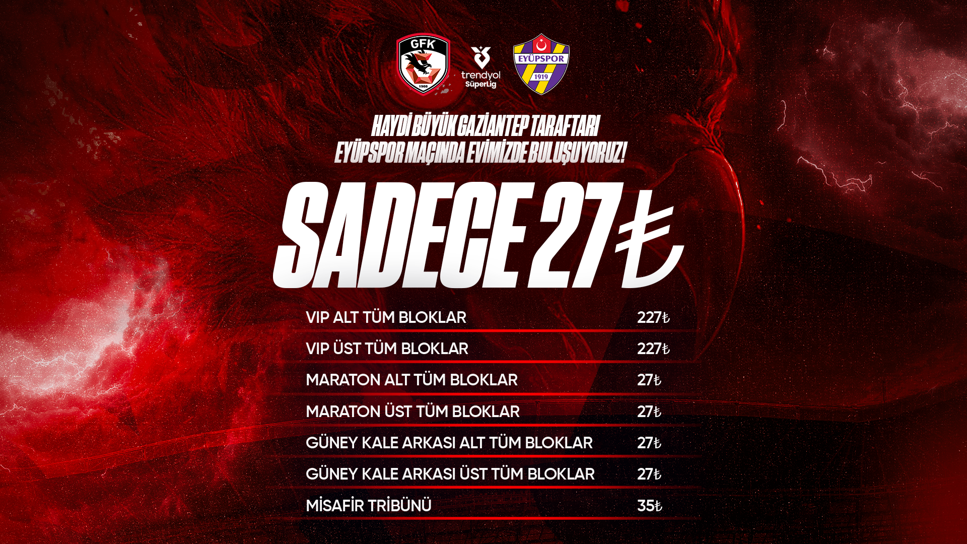 Gaziantep Büyükşehir Stadyumu'nda oynanacak olan karşılaşmanın bilet fiyatları, Maraton ve Kale Arkası biletleri 27 TL’den satışa çıktı.