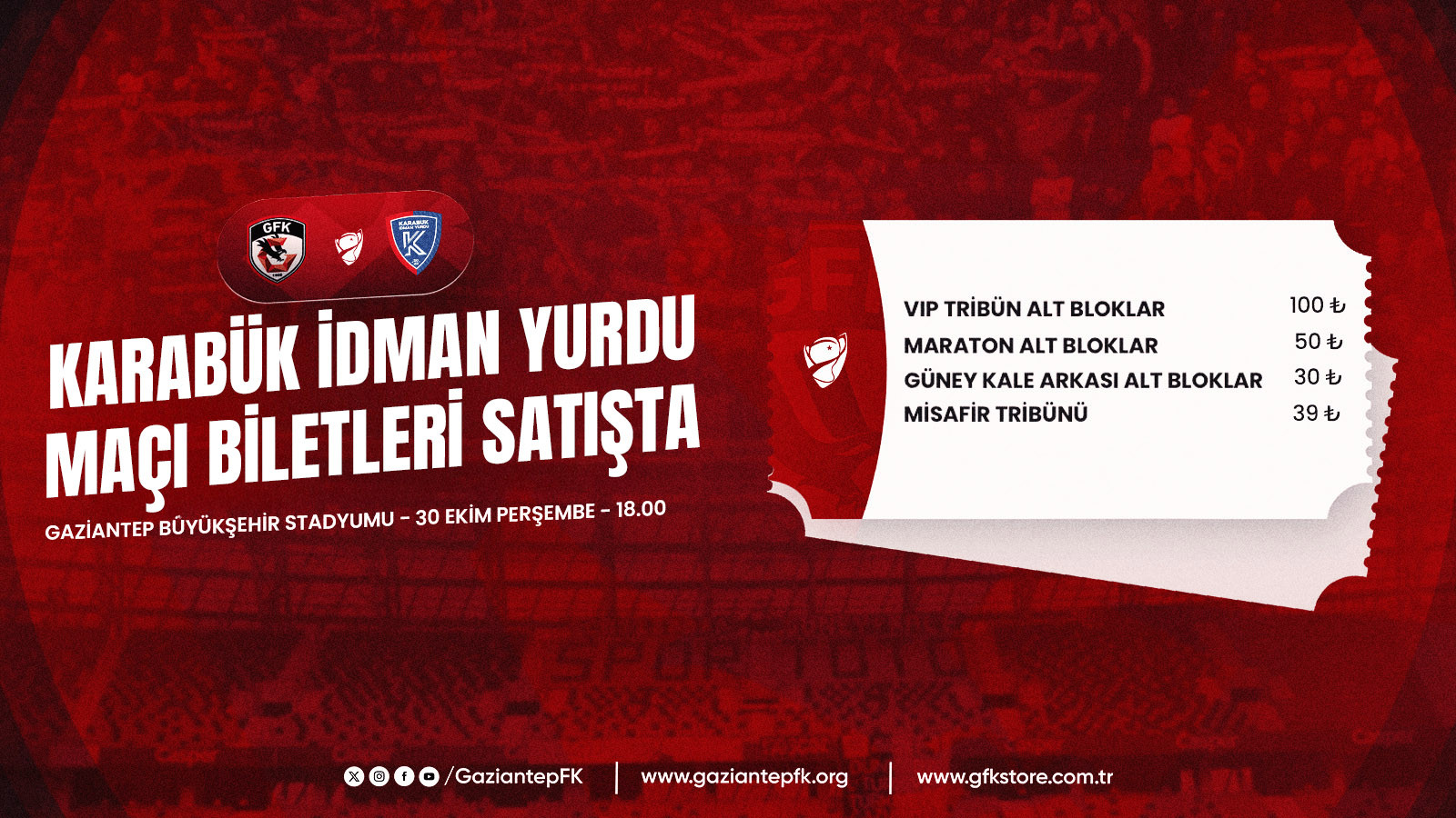 Gaziantep Futbol Kulübümü Ziraat Türkiye Kupası 3. Eleme Turu’nda Karabük İdman Yurdu’nu konuk edeceği karşılaşmanın biletleri satışa çıktı.