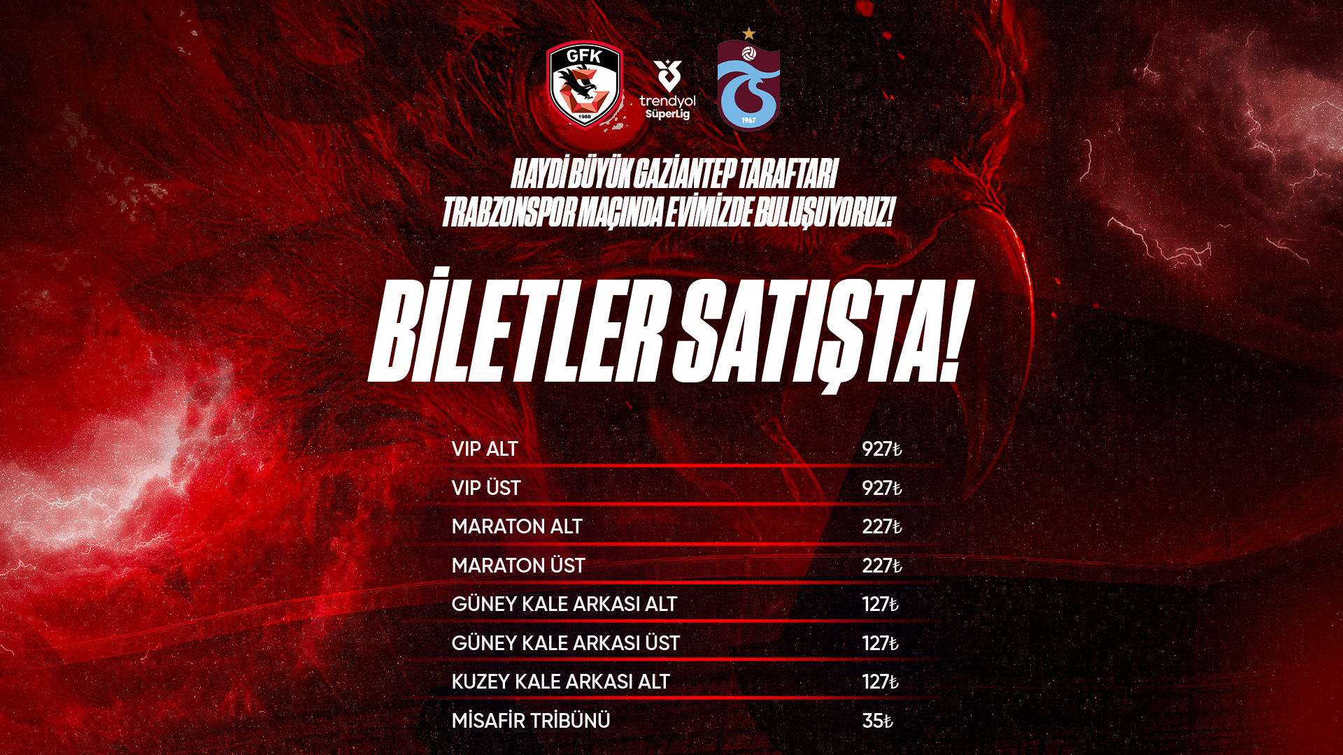 Gaziantep Büyükşehir Stadyumu'nda oynanacak olan karşılaşmanın bilet fiyatları 127 ile 927 TL arasında belirlendi. Kırmızı sşyahlı taraftarlar BiletiniAl Dijital kartlarına www.biletinial.com adresinden ve Millet Bahçesinde bulunan Gaziantep FK BiletiniAl noktasından bilet dolumu yapabileceklerdir.