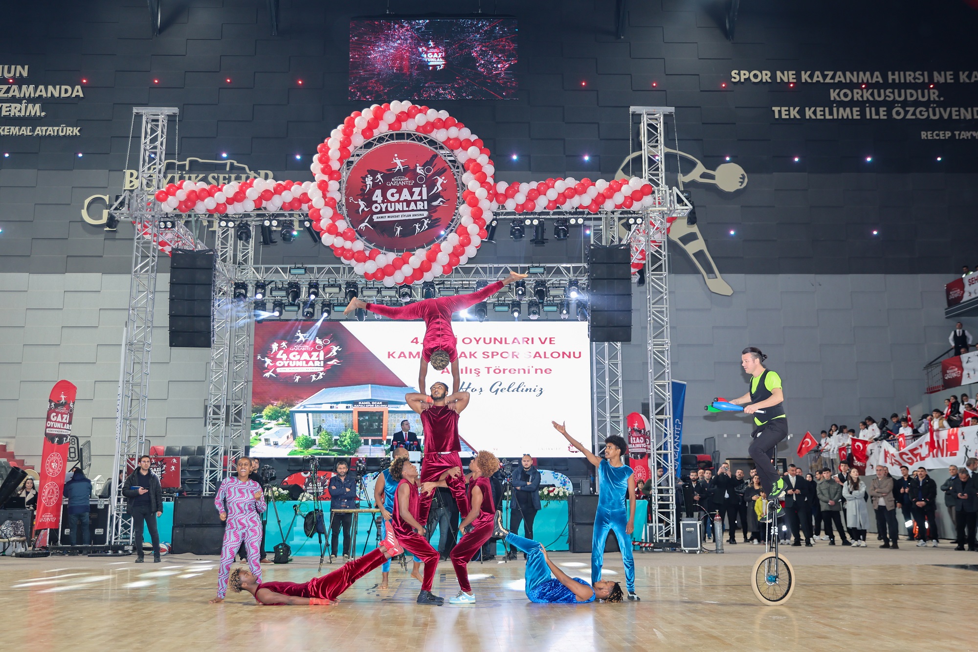 Renkli görüntülerle yapılan açılışta ayrıca akrobasi ve cambaz gösterilerinin yanı sıra basketbol gösterisi sergilendi. Programda ayrıca 81 ilden gelen öğrenciler bayraklar eşliğinde salonda yer aldı. Salonun açılışı için kurdele kesildi, yakılan meşale ile de Gazi Oyunları resmen başladı.