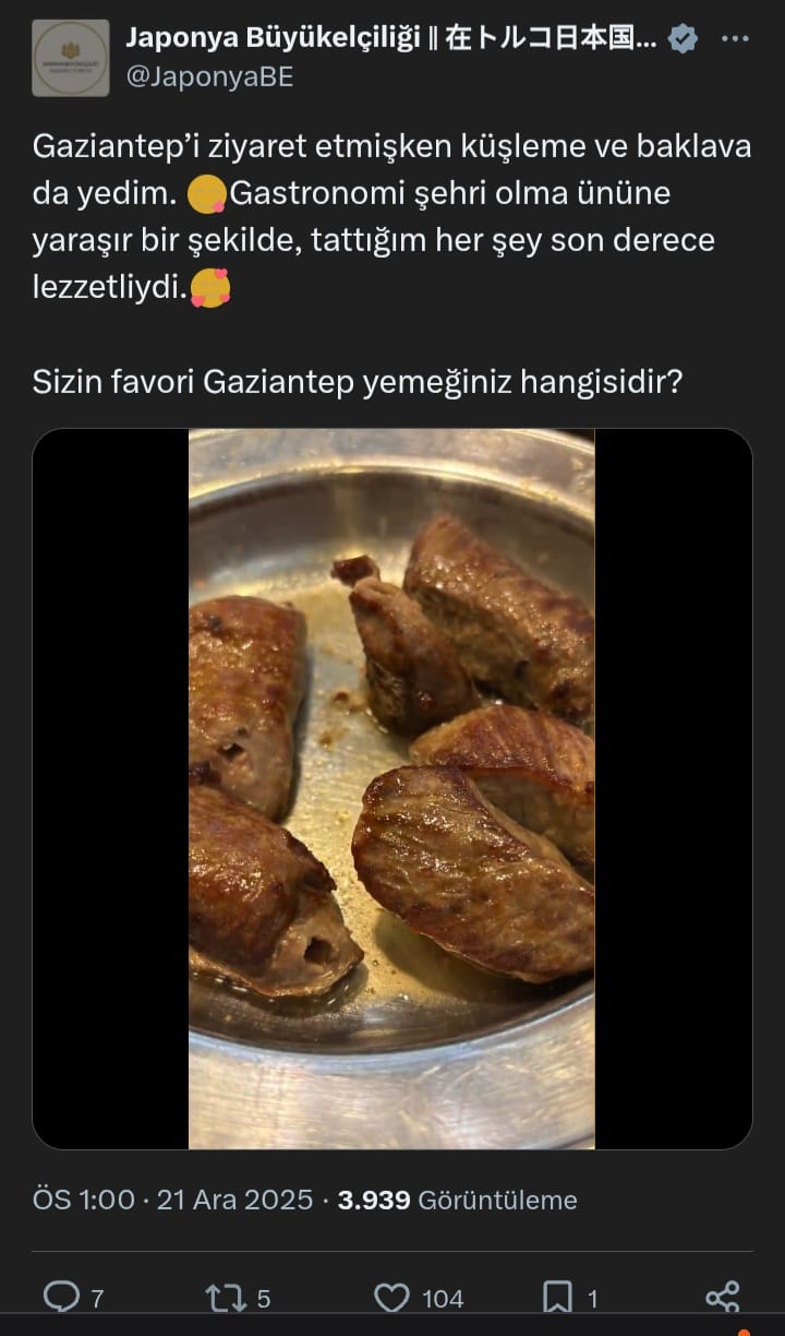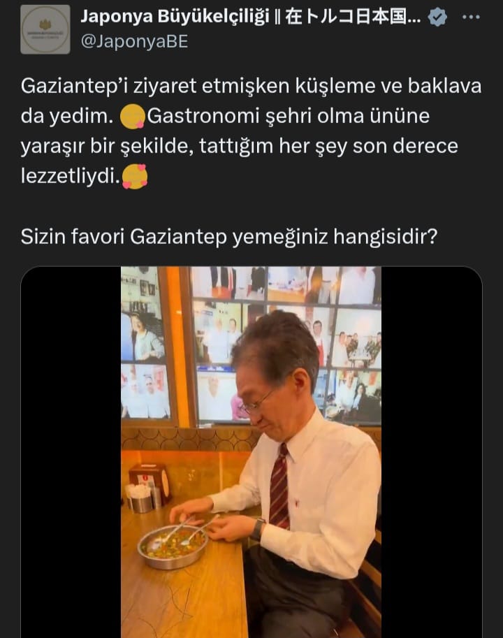 Gaziantep’in gastronomi alanındaki ününe dikkat çeken TAMURA, ziyaret sırasında sosyal medyadan “Sizin favori Gaziantep yemeğiniz hangisi?” sorusunu yöneltti. Büyükelçi, Gaziantep mutfağının zenginliğini bizzat deneyimleme fırsatı bulduğunu ifade etti.