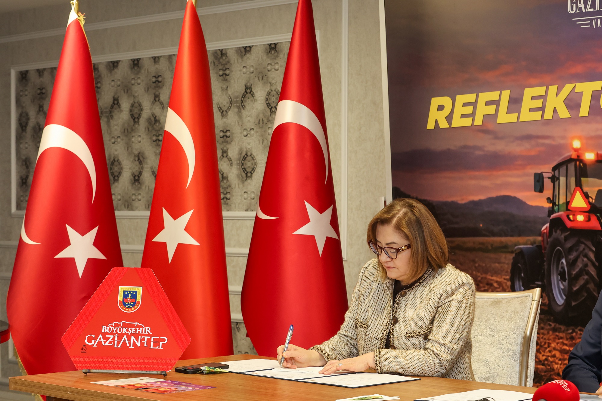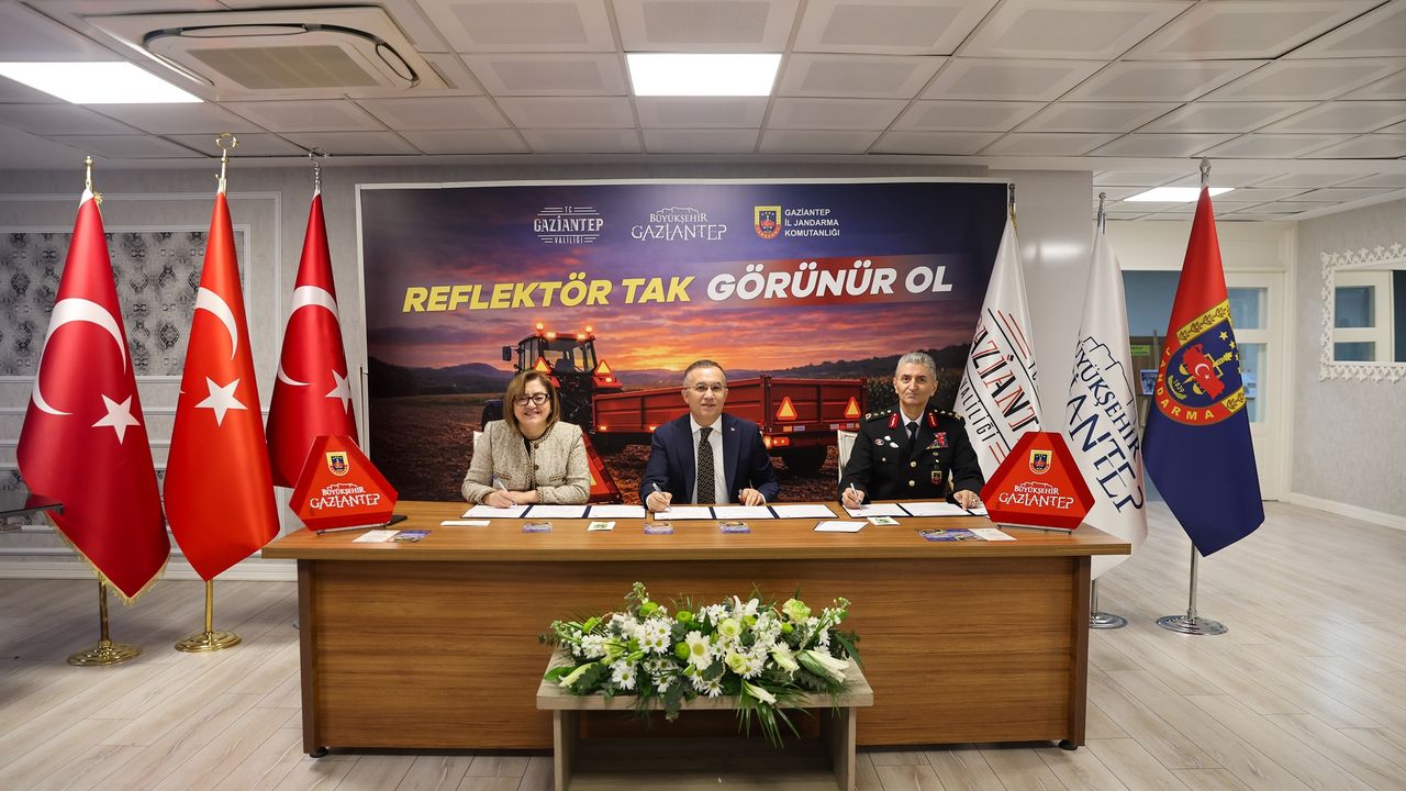 Gaziantep Valisi Kemal Çeber, ÇKS’ye kayıtlı ve traktörü olan çiftçilere reflektörlerin dağıtılacağını, can ve mal kaybı yaşanmaması için bunların kullanılmasının zorunlu olduğunu ifade ederek, “Bazen çok basit tedbirler can güvenliğinizi muhafaza etmenize yeterli oluyor. Gaziantep’te Çiftçi Kayıt Sistemi’ne kayıtlı yaklaşık 46 bin 500 çiftçimiz var ve bunların yüzde sekseninin traktörü bulunuyor. Yani yaklaşık 38 bin traktör var. Özellikle tarımsal faaliyetlerin yoğun olduğu dönemlerde ve hasat zamanında traktörleri trafikte sıkça görüyoruz. Ülke genelindeki tespitler de traktör kazalarında bu durumu ortaya koyuyor. Biz her sorunumuzu, her derdimizi ve her sevincimizi paylaştığımız gibi bunu da Büyükşehir Belediyemizle paylaştık ve ‘ne yapabiliriz’ dedik. Her konuda olduğu gibi Sayın Fatma Şahin yine bizimle birlikte bu işe el attı. Bugün de bu protokolü imzalıyoruz. Protokol sonucunda inşallah çiftçi kardeşlerimize bu reflektörler dağıtılacak. Biz de kendilerinden reflektörleri mutlaka hemen kullanmaya başlamalarını ve traktörlerine takmalarını rica ediyoruz” dedi.