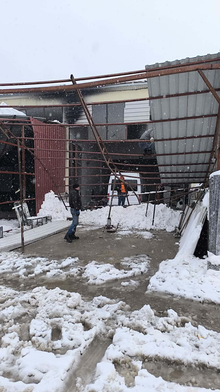 Esnaf çöken çatıların kaldırılması için çalışma yaptı. Bir iş yerinin altında bulunan araç, çatının çökmesi sonucu hasar gördü.