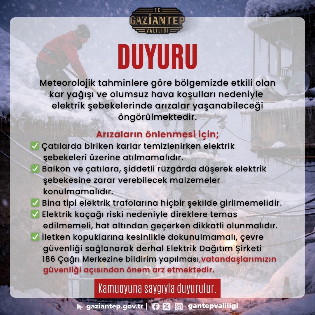 Valilik tarafından yapılan açıklamada, meteorolojik tahminlere göre kar yağışı ve şiddetli hava şartlarının elektrik altyapısını olumsuz etkileyebileceği belirtilerek, arızaların önlenmesi ve vatandaş güvenliğinin sağlanması amacıyla dikkat edilmesi gereken hususlar paylaşıldı.