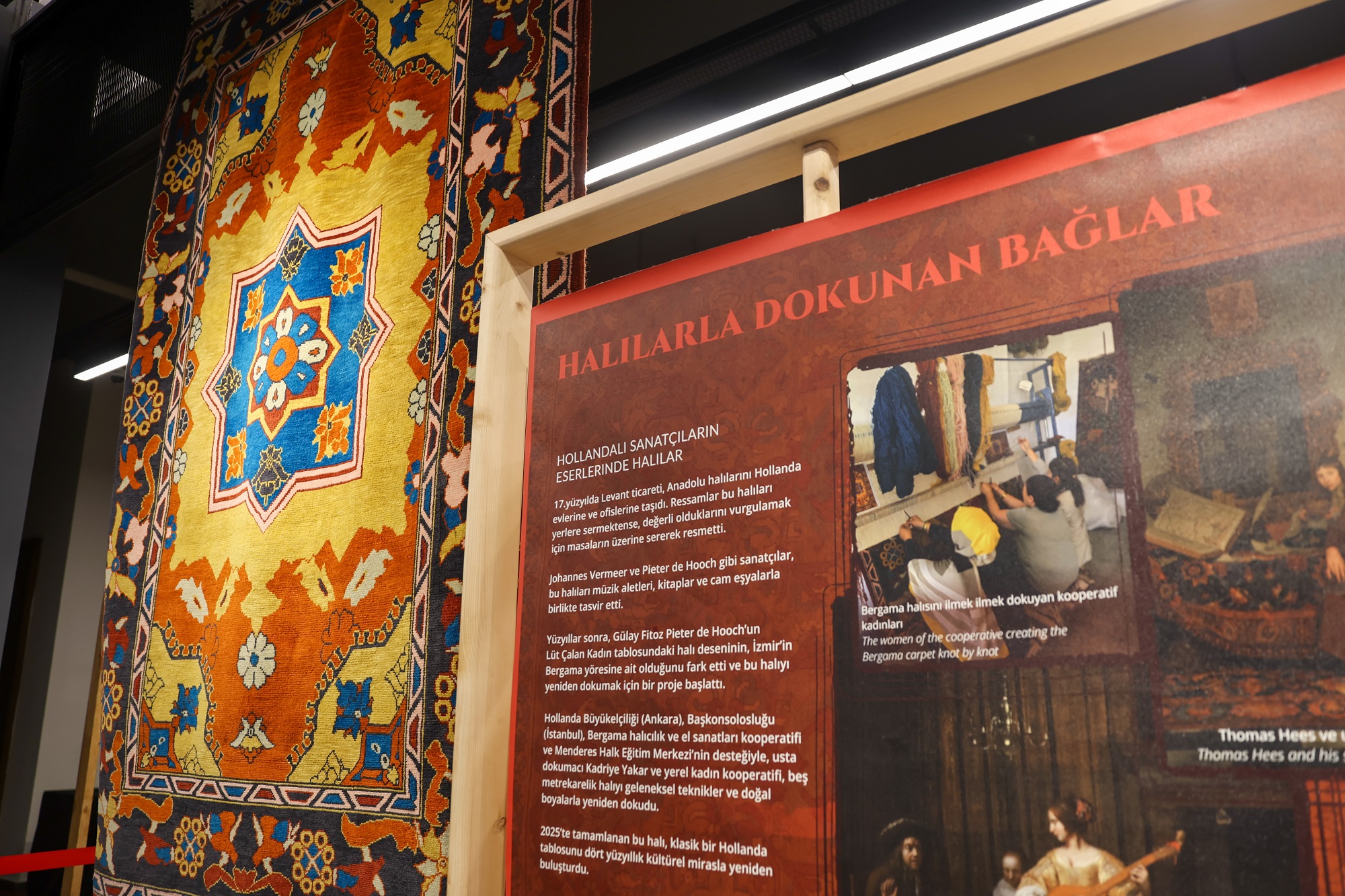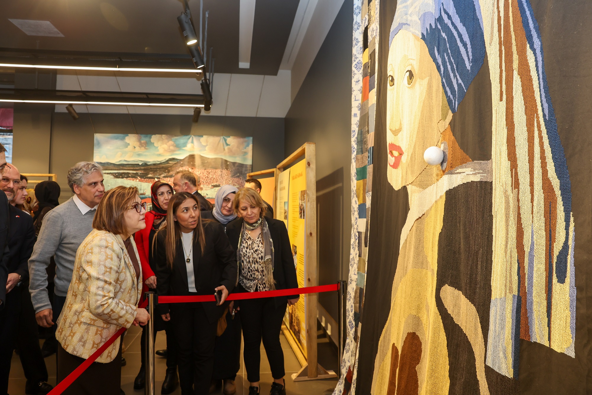 Serginin merkezinde, Johannes Vermeer’in ünlü eseri İnci Küpeli Kız’ı betimleyen bir duvar halısı bulunuyor. “Umut Halısı Projesi” kapsamında hazırlanan eser, 2023 yılında bölgeyi etkileyen depremlerin ardından Kahramanmaraş’ta yüzden fazla depremzede kadın tarafından elle dikildi.