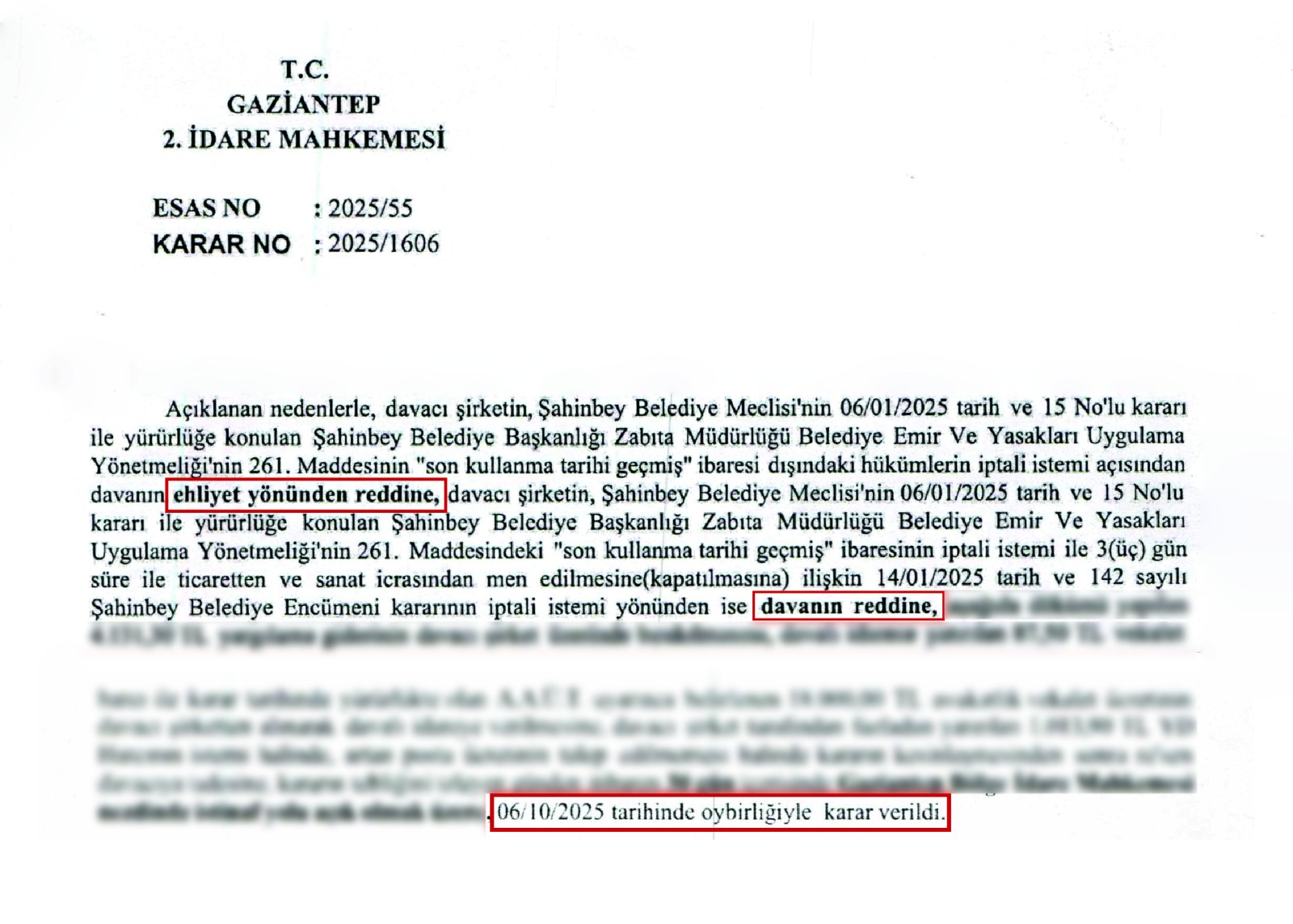 Şahinbey Belediyesi, vatandaşın sağlığını korumak amacıyla yaptığı denetimlerde bir zincir marketin şubesinde son kullanma tarihi geçmiş ürün satışı tespit etmiş ve söz konusu iş yerini 3 gün süreyle kapatma kararı almıştı. Zincir market bu karara itiraz ederek konuyu yargıya taşımıştı. Sonuçlanan davada mahkeme, Şahinbey Belediyesi’nin uygulamasını hukuka uygun bularak belediyeyi oy birliğiyle haklı gördü. Böylece, Şahinbey Belediyesi’nin aldığı karar emsal teşkil edecek bir nitelik kazandı.