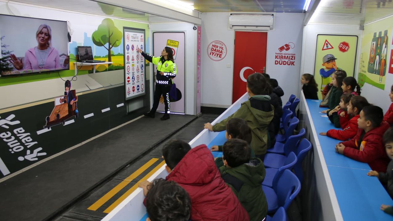 Ali Öztürk Ortaokulu bahçesinde konuşlandırılan tırda öğrencilerine trafik polisi tarafından tır içinde teorik bilgiler verildi. Daha sonra açık alana çıkan öğrenciler, burada trafik kurallarına ilişkin uygulamalı bilgi aldı.