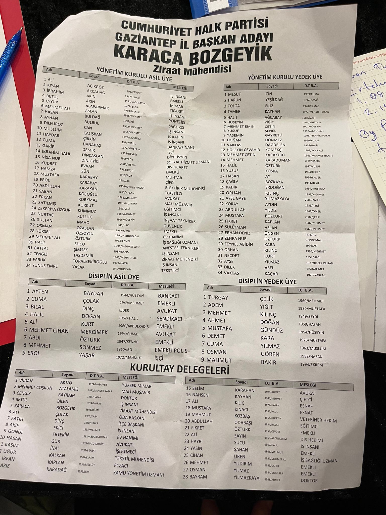 Açıklanan liste, Bozgeyik’in Gaziantep örgütlenmesine dair planlarını ve kongredeki örgütsel perspektifini de yansıtıyor.