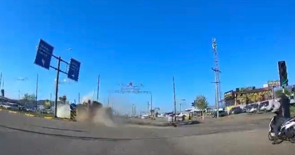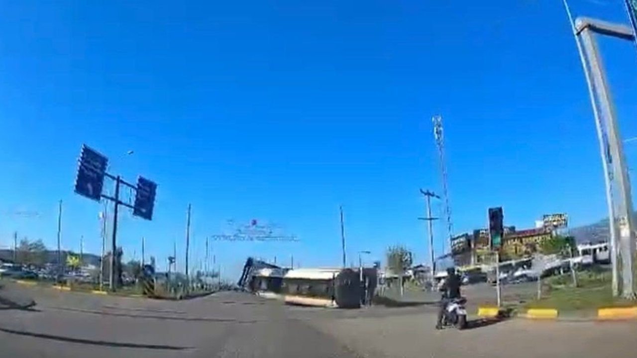 Kaza anı, kavşaktaki başka bir aracın güvenlik kamerasına yansıdı. Görüntülerde, kavşaktan dönmeye çalışan tırın bir anda kontrolden çıkarak devrilmesi ve ortalığı toz bulutu kaplaması yer aldı.