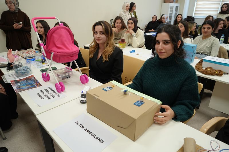 Görme engelli anneler için sensörlü bebek arabası projesi yapan öğrenci Eda Nur Kılınç, "Projeye yaklaşık üç ay önce başladık. Yazılımcı arkadaşlarımla birlikte çalıştım. İlham kaynağım ise kliniklerde ve sahada karşılaştığımız, görme engelli annelerin bağımsız hareket edememesi, toplumsal eşitlikten uzak kalması ve özgürlüklerini yeterince yaşayamadıkları durumlar oldu. Amacım, onların da topluma daha aktif şekilde katılmalarını sağlamak, geri planda kalmamalarına katkı sunmak ve özgürlüklerini elde etmelerine yardımcı olmaktı. Biz ebeler yalnızca klinikte değil, toplumda insanların yaşadığı sorunlara da çözüm üretmek istiyoruz. Çıkış noktam da buydu. Engellerin bağımsızlığa engel olmadığını hatırlatmak ve görme engelli annelerin hayata daha güçlü şekilde karışmasını sağlamak istedim. Bu amaçla, görme engelli anneler için sensörlü, akıllı bir bebek arabası tasarladım. Arabanın ön kısmına iki adet sensör yerleştirdim. Ana karta yazılım yüklendi. Önüne bir engel çıktığında, açma-kapama tuşu aracılığıyla sensörlü uyarı sistemi devreye giriyor ve kullanıcıyı bilgilendiriyor" şeklinde konuştu.