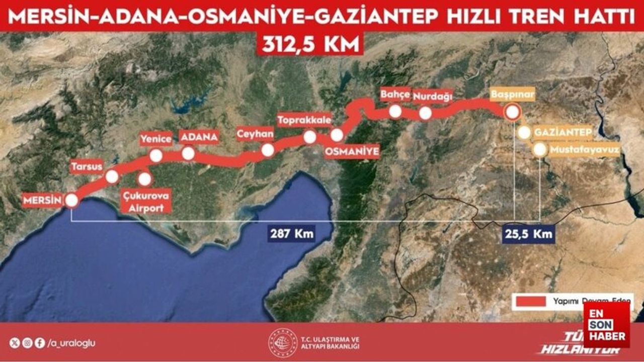Ulaştırma ve Altyapı Bakanı Abdulkadir Uraloğlu, Mersin-Adana-Osmaniye-Gaziantep Hızlı Tren Hattı Projesi'yle Mersin-Gaziantep güzergahında 6 saat 23 dakika olan seyahat süresini 2 saat 15 dakikaya düşüreceklerini bildirdi.