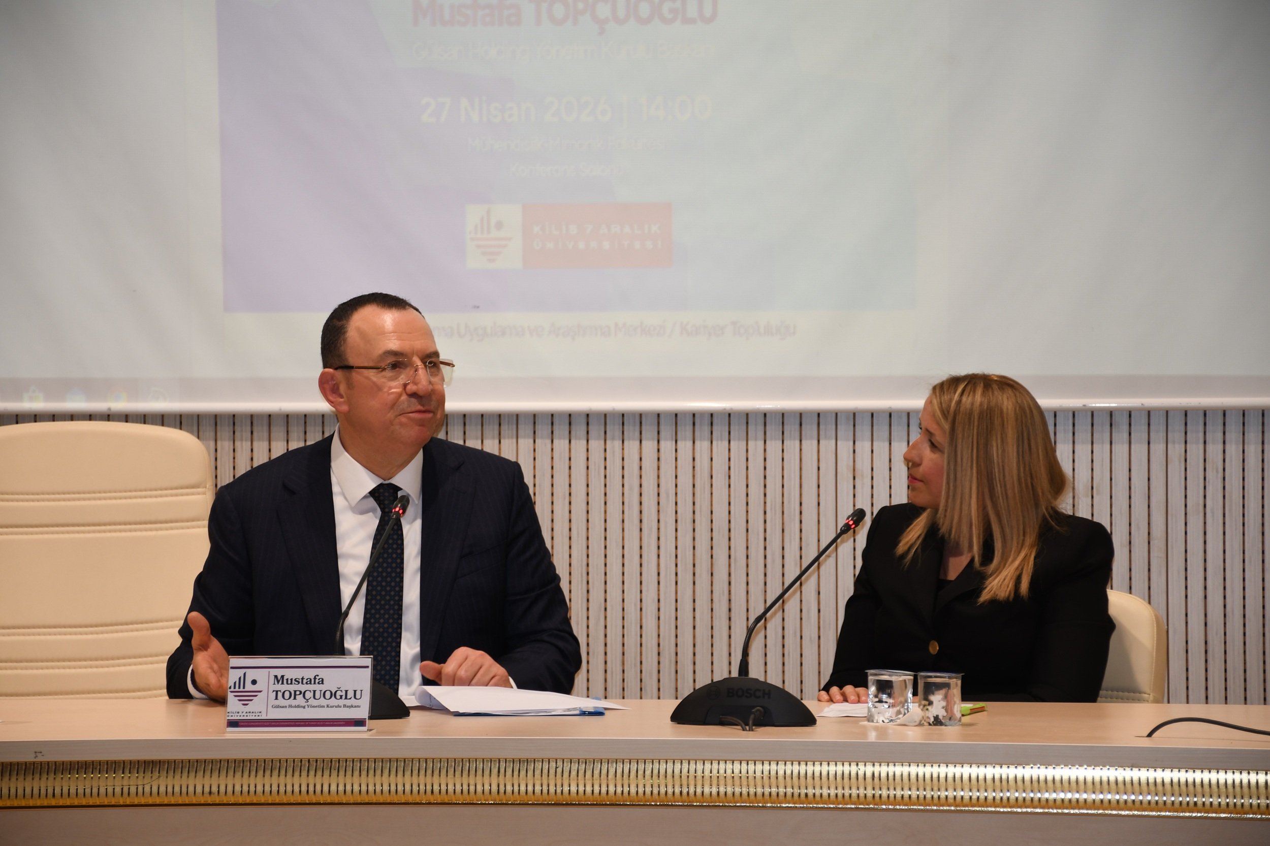 Mühendislik ve Mimarlık Fakültesi’nde gerçekleşen söyleşinin moderatörlüğünü Dr. Öğretim Üyesi Seher Maşkaraoğlu yaptı. Kilis 7 Aralık Üniversitesi Rektörü Prof. Dr. Zekeriya Akman, etkinliğin açılışında yaptığı konuşmada, “Tecrübe kolay kazanılmıyor. Bu nedenle üniversite olarak başarılı insanları öğrencilerimizle buluşturarak tecrübelerinden faydalanmayı önemsiyoruz. Bugün de Gülsan Holding Yönetim Kurulu Başkanı Mustafa Topçuoğlu’nu aramızda görmekten büyük bir mutluluk duyuyoruz. Kendisine bizleri kırmayarak etkinliğimize katıldığı için teşekkür ediyoruz” dedi.