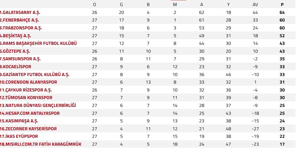 Ligin 27. haftasının tamamlanmasının ardından oluşan puan durumu şu şekilde: