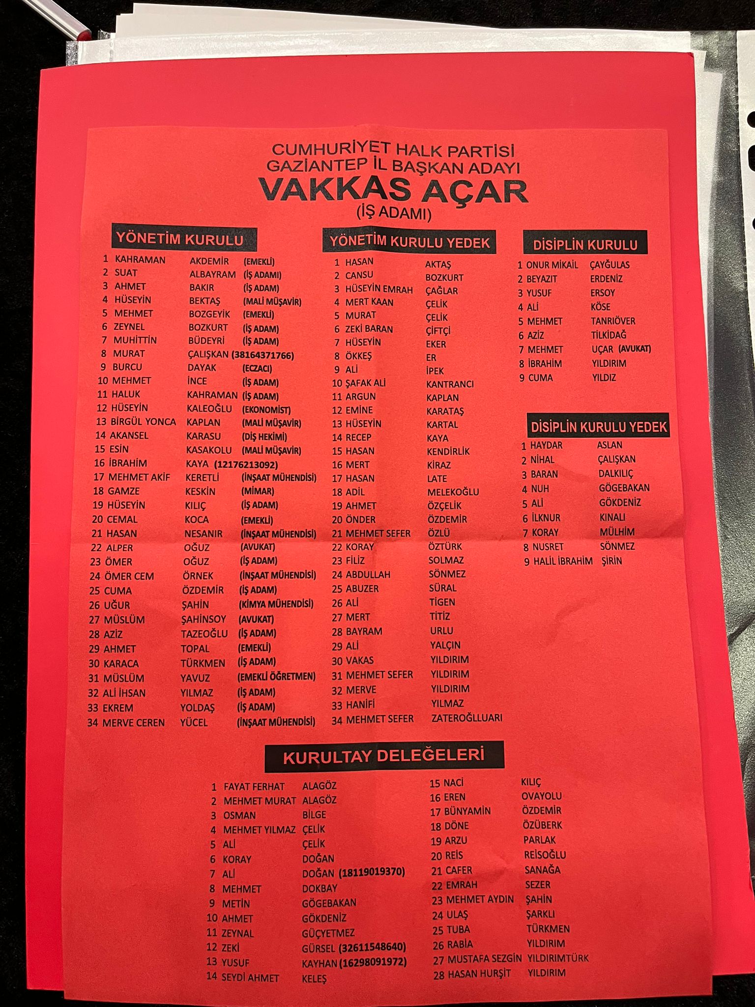 Vakkas Acar’ın öncülüğündeki kırmızı liste, kongre salonunda delegelere broşürler aracılığıyla tanıtıldı. Listede yer alan isimler, partinin Gaziantep örgütlenmesinde görev yapacak yönetim kurulu, disiplin kurulu ve kurultay delegeleri olarak belirlendi.