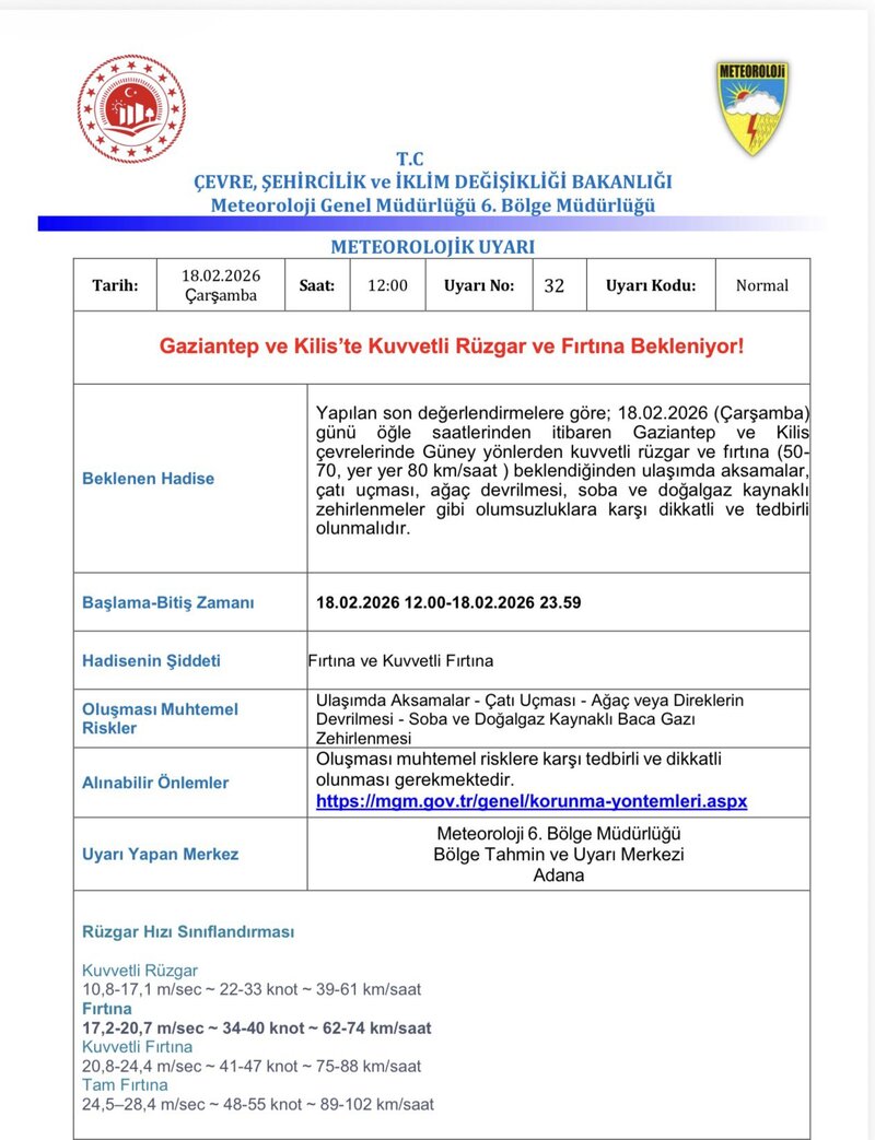 Valilikten yapılan açıklamada, “Meteoroloji Bölge Müdürlüğü tarafından yapılan son değerlendirmelere göre; 18.02.2026 (Çarşamba) günü öğle saatlerinden itibaren Gaziantep çevrelerinde Güney yönlerden kuvvetli rüzgar ve fırtına beklendiğinden ulaşımda aksamalar, çatı uçması, ağaç devrilmesi, soba ve doğalgaz kaynaklı zehirlenmeler gibi olumsuzluklara karşı dikkatli ve tedbirli olunmalıdır.“ denildi.