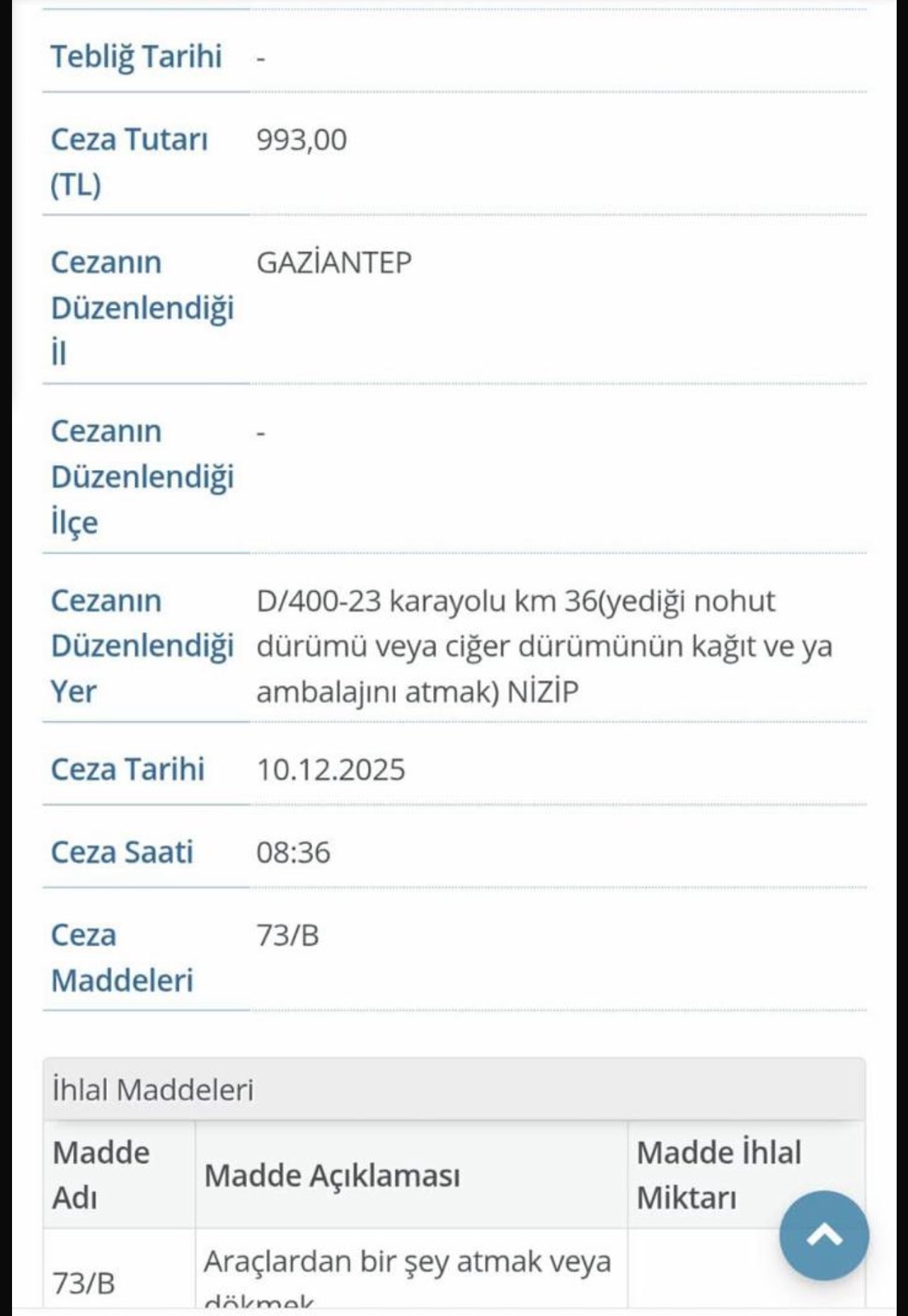 Ceza tutanağında, aracın içinden “yediği nohut dürümü veya ciğer dürümünün kâğıt ya da ambalajının” yol kenarına atıldığının belirlendiği ve sürücünün Karayolları Trafik Kanununa uymadığı gerekçesiyle cezalandırıldığı kaydedildi.